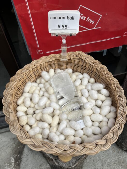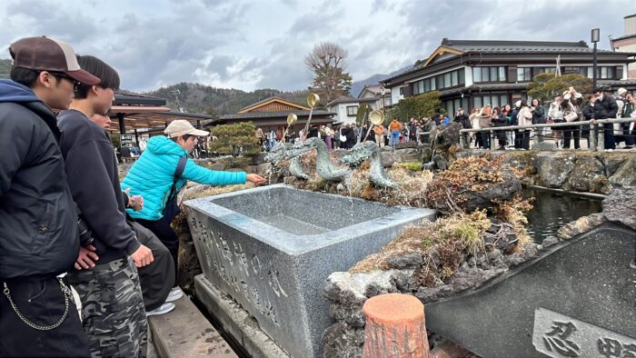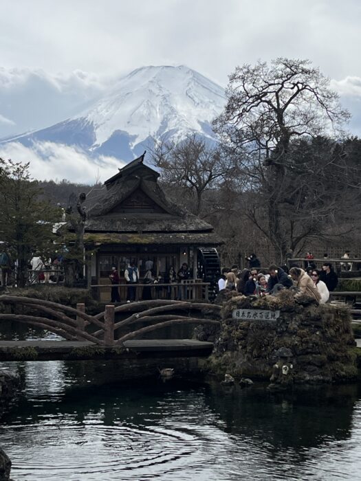 A second location was the source of Mt Fuji spring water. Yes, I stood in line to get a bottle full direct from the mouths of three dragons. They like to decorate their spring water spouts this way, and it appears often at shrine washing stations. The view in this beautifully historic town was divine. The mountain didn’t cooperate exactly, but it was visible, like this, hanging over ancient style thatch roofs and waterwheels. Ponds were full of trout, and merchants sold wares along the road on the way in.