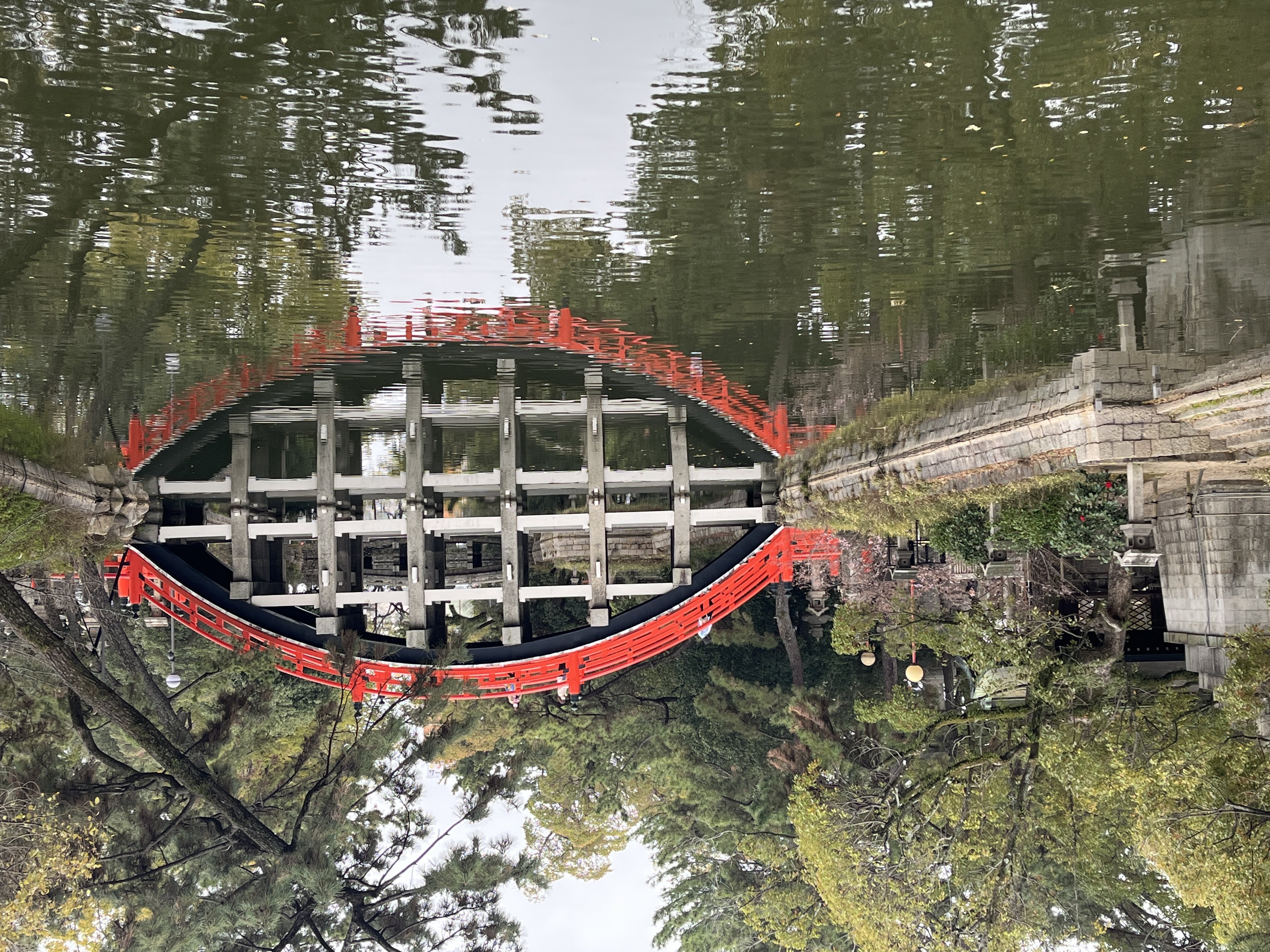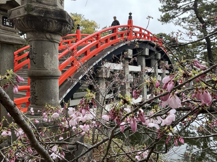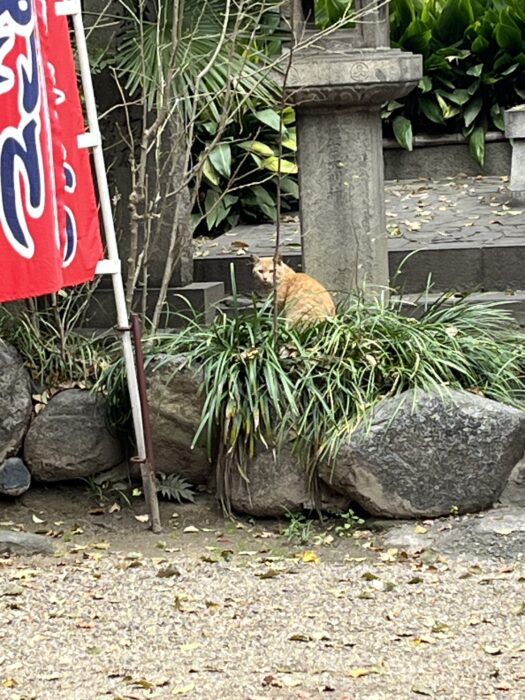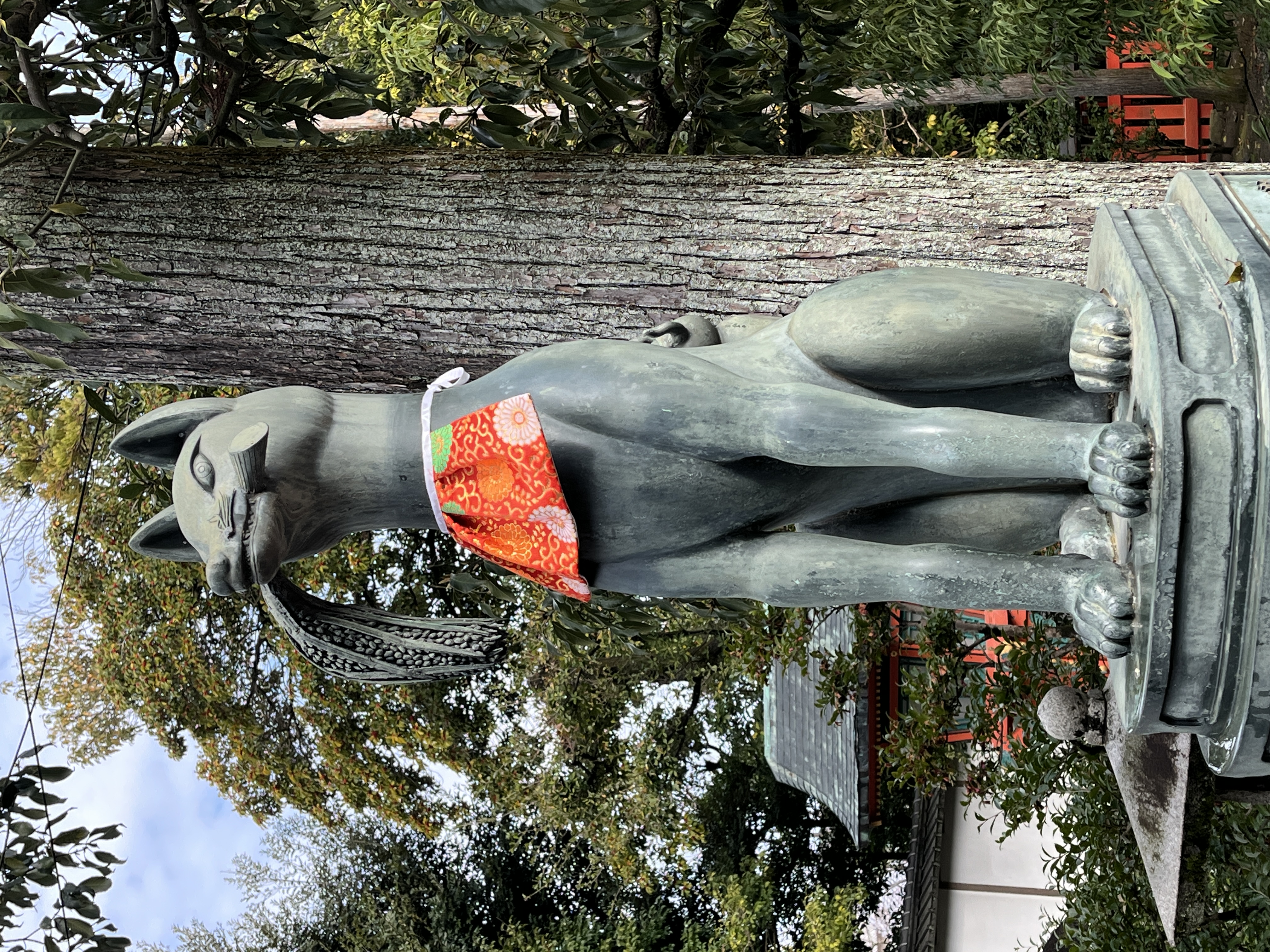 This is a huge complex, mostly forested, but it also trails into the city, through some city blocks with shrines of all sorts associated with it. Ancient history, architecture, and—most importantly—cats captured my interest. This area stood out as the only place I visited that hosted any cats at all. Many hid in corners watching for people, never letting them get too close. The Nankun-sha shrine in Sumiyoshi serves as the source of the Shōfuku Neko (beckoning lucky cats). Feline imagery covered the grounds: cats appeared on flags, sat as stuffed animals atop sake casks, curled up among hay bales, and occupied prominent displays alongside other forest creatures. The red drum bridge (Sorihashi) was fabulous, and I photographed it from many angles, wishing for a blue sky. Hey you get what you get.